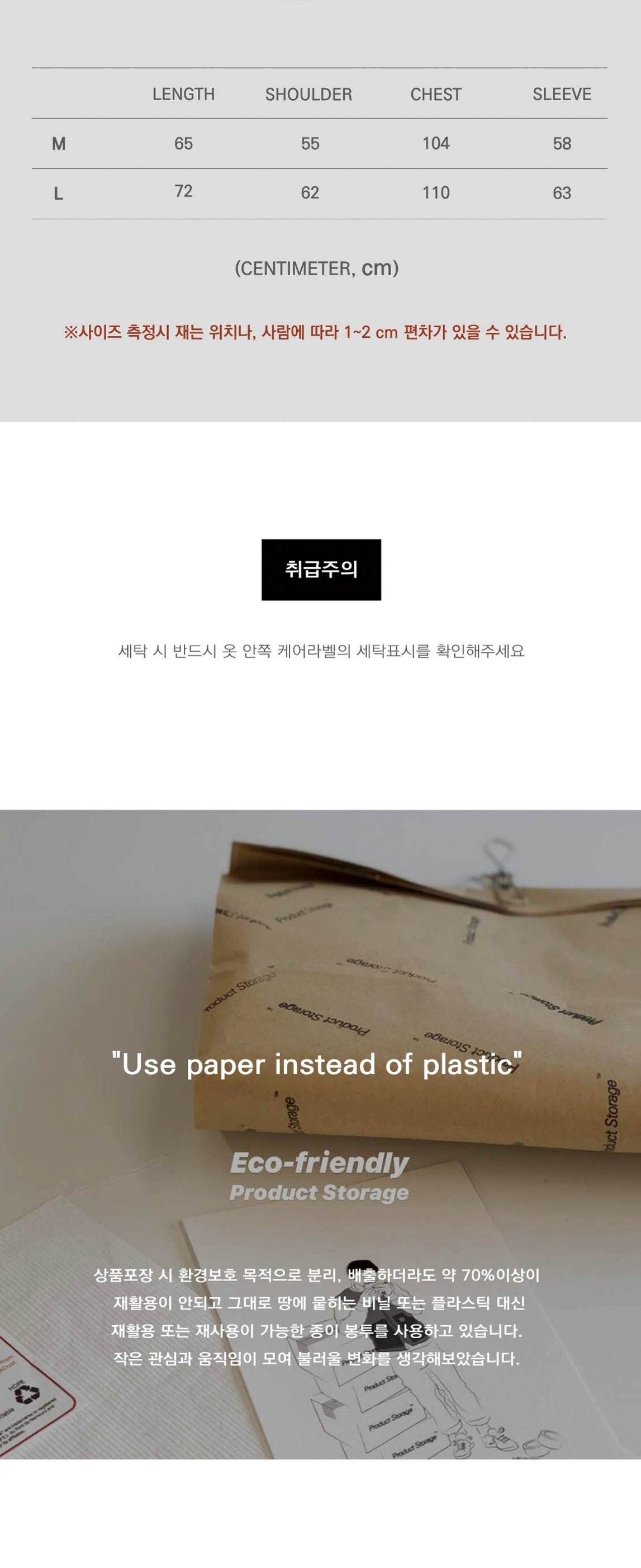 상품포장 시 환경보호 목적으로 분리, 배출하더라도 약 70%이상이 재활용이 안되고 그대로 땅에 뭍히는 비닐 또는 플라스틱 대신 재활용 또는 재사용이 가능한 종이 봉투를 사용하고 있습니다. 작은 관심과 움직임이 모여 불러울 변화를 생각해보았습니다.